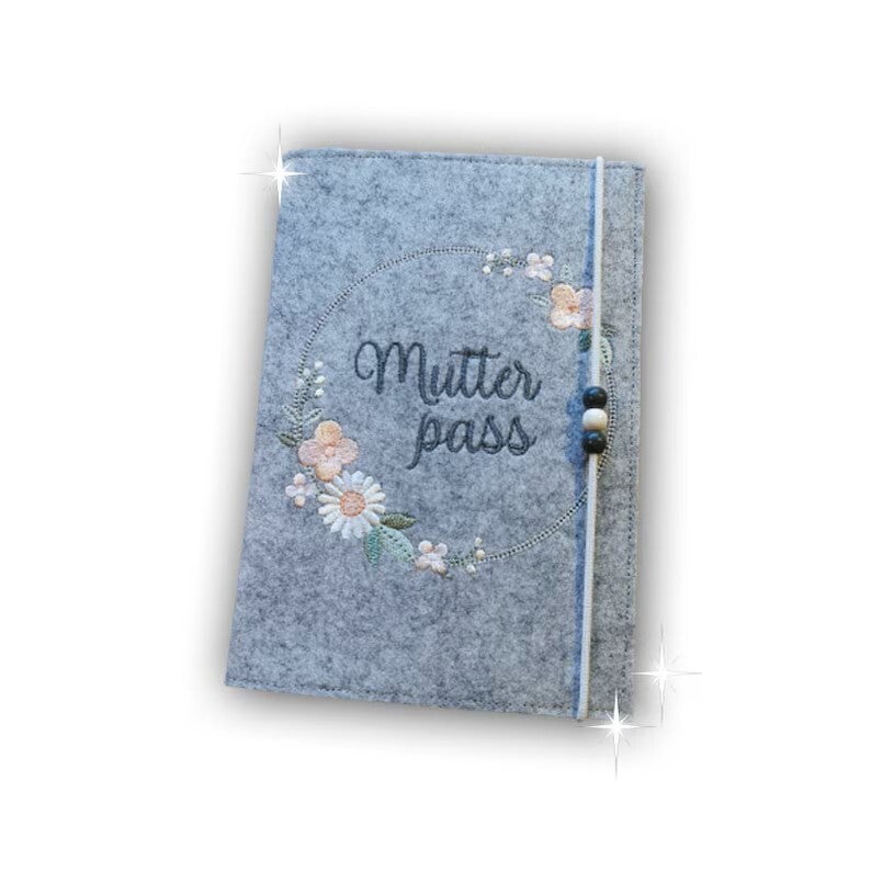 Im Inneren des Kranzes ist das Wort „Mutterpass“ eingestickt.